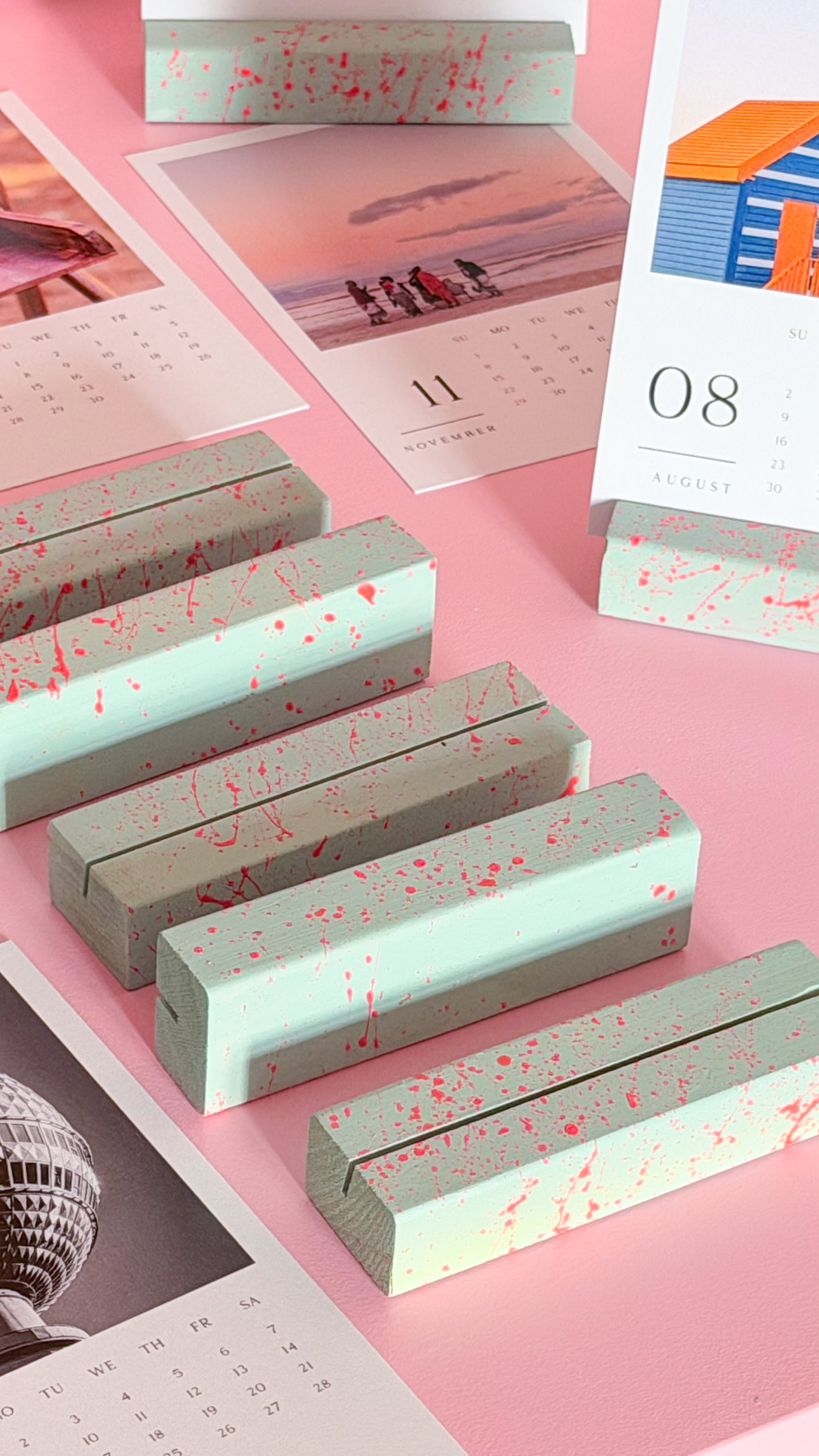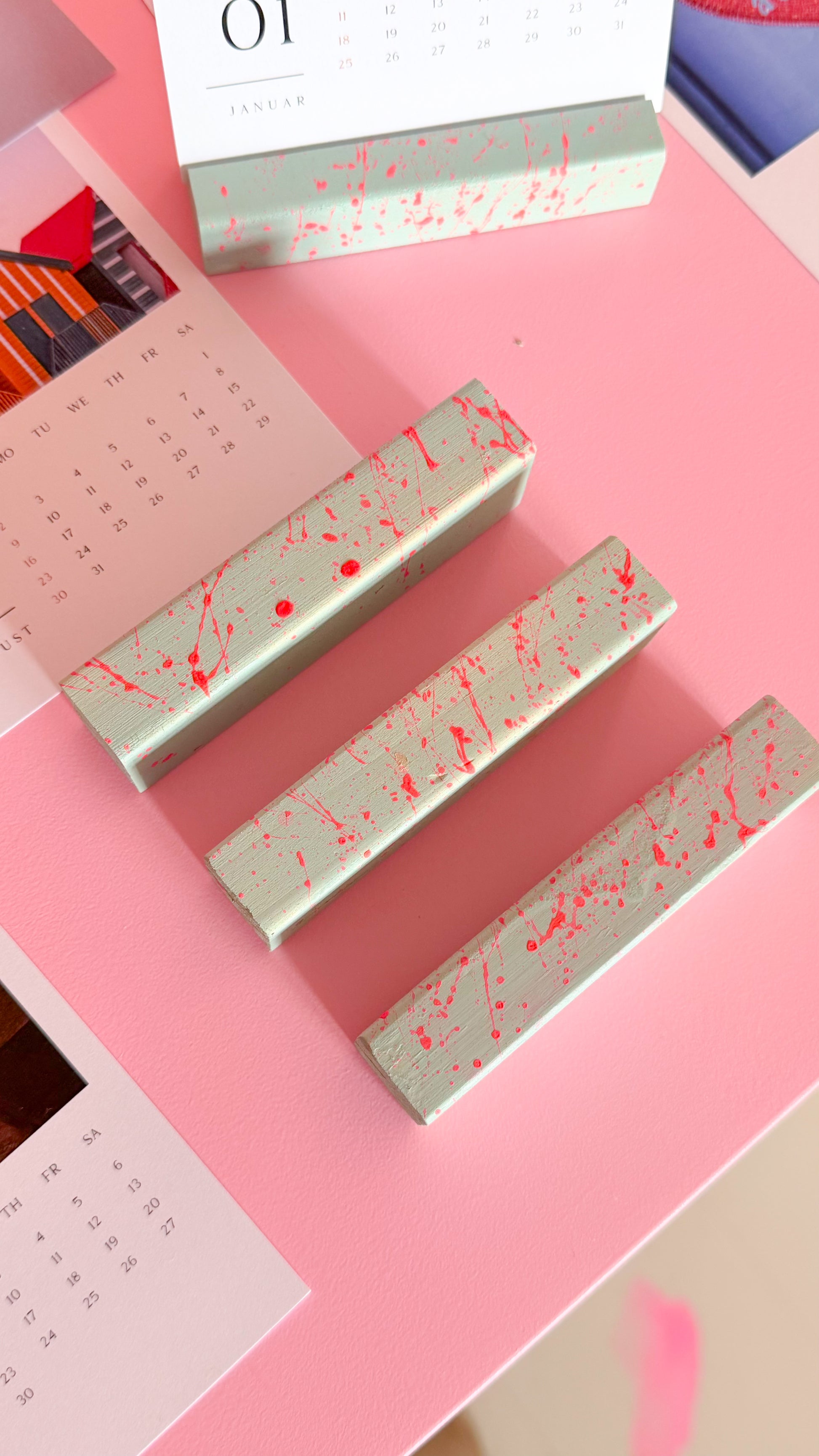 Die Halter sind von Hand gestaltet – jedes Stück ein Unikat – mit neonfarbenen Sprenkeln, die Kontrast und Leichtigkeit bringen.