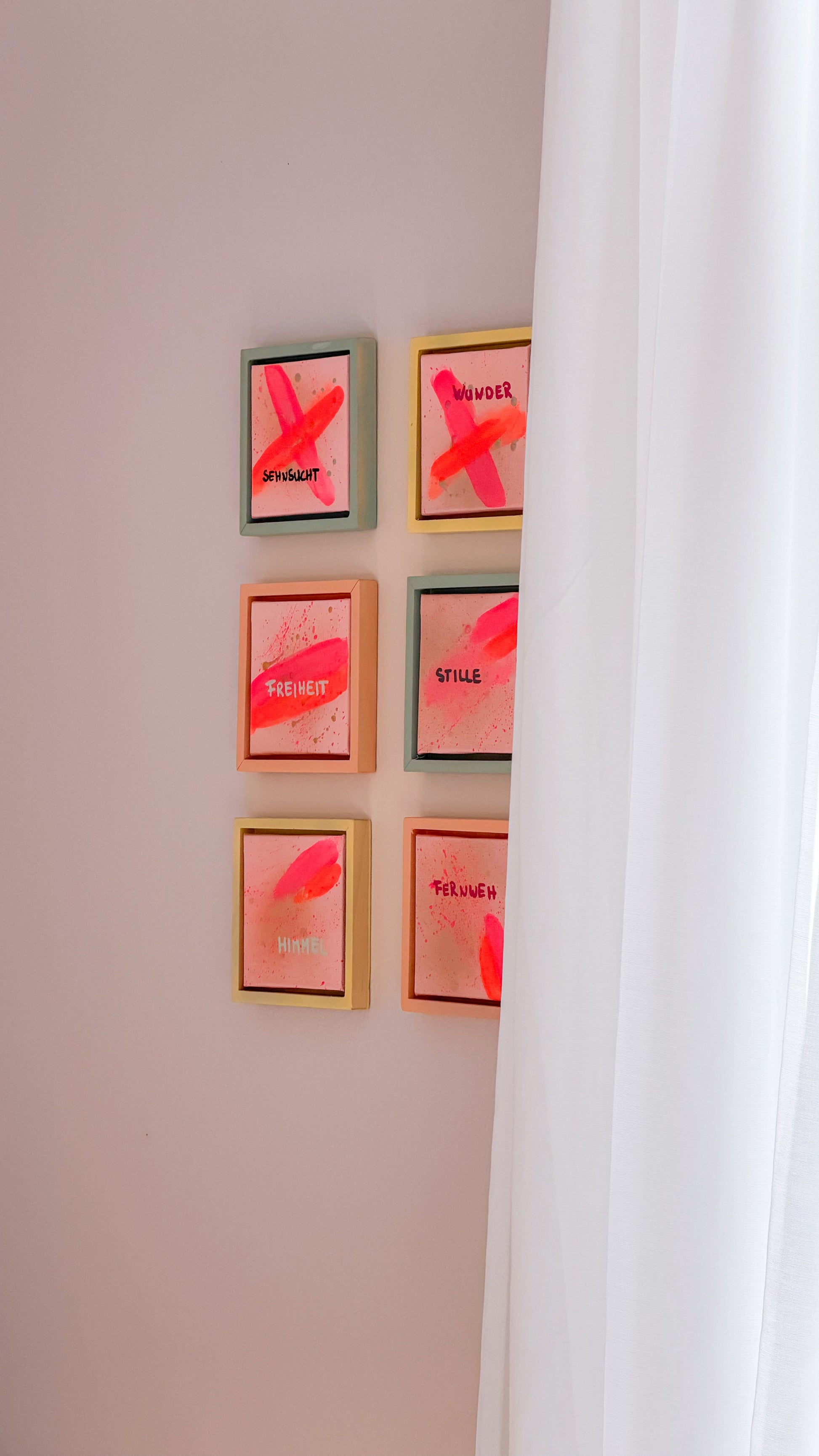 Jede Leinwand bekommt anschließend einen passenden Holzrahmen (12 x 12 cm), den ich farblich von Hand anpasse. So wirkt jedes Stück wie ein kleines, abgeschlossenes Kunstwerk – pur, ehrlich und mit Charakter.